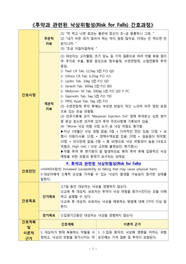 해당 자료가 필요하신 분은 “투약과 관련된 낙상위험성” 으로 해피캠퍼스에서 확인해 보세요.