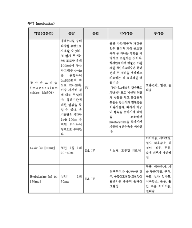 3. .50% magnesium sulfate은 경련, 자간, 전해질보급, 자궁경직의 효과가 있다. Lasix inj, Hydralazine hcl inj고혈압 치료제.